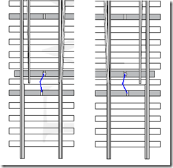 I initially bought some Caboose Industries ground throws, but their large size compromised the appearance of the code 55 track. Why go to the trouble of near-scale track only to butcher the look with an oversize ground throw? I would have been better off to use Peco code 55 and lived with the European tie spacing. While there have been some really good ideas to disguise the CI throw’s oversize appearance, I didn’t think this would work since my spline roadbed would basically leave the throws unsupported. I tried using electric toggle switches with linkages on my test bed layout. While simple enough, I’ve had some problems with the toggle throw being longer than the turnout throw. The turnouts on my test bed layout were soldered together, so they were able to handle the stress. I feared that the Atlas code 55 turnouts might not fare so well and there’s still that whole mounting thing. That left me with the finger-flick method with either a center-over spring or a friction pad. I tried doing a friction pad on the bottom of the throwbar, but worries of what would happen once the friction pad wore down kept me from pursuing this route. Still the friction pad is a great idea and is probably something I’ll consider again.